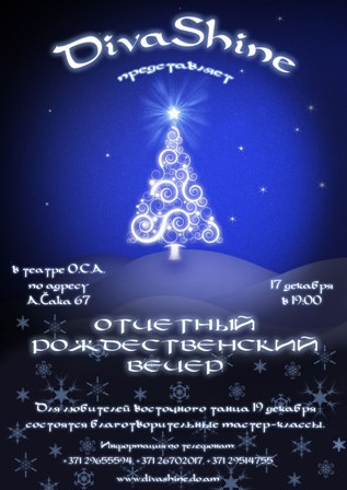 17 декабря DivaShine организует Oтчётный Рождественский вечер восточного танца. Начало в 19.00, в театре Общества Свободных Актёров по адресу А.Čaka 67.